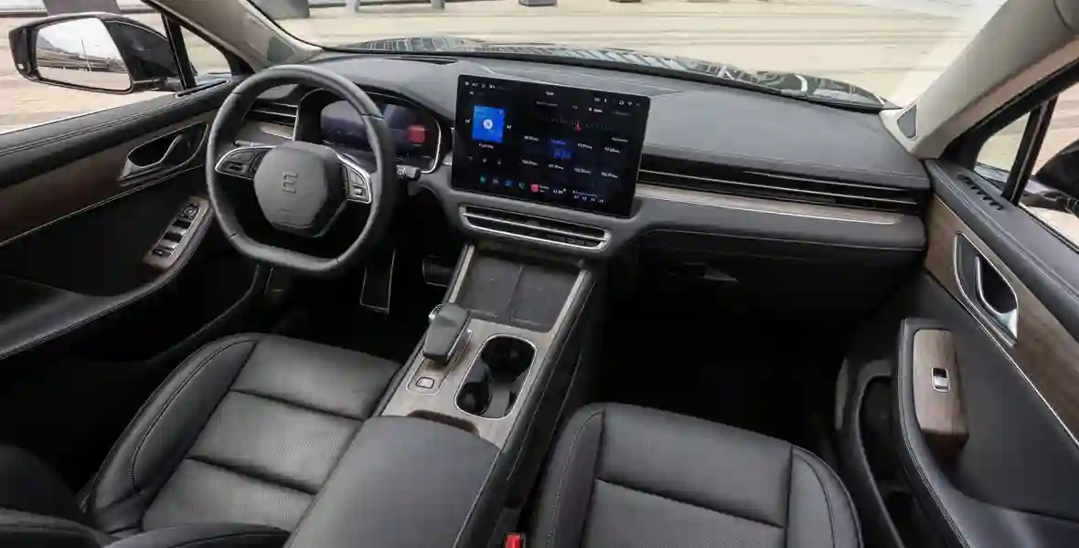 Если Seres Aito M5 имеет гибридную силовую установку, то EVOLUTE i‑JET — полностью электрический. В салоне можно долго искать кнопку, которая «включает» машину, потому что… её здесь нет. Чтобы кроссовер «проснулся», нужно лишь нажать на педаль тормоза. Но сидеть все так же удобно, перед глазами — информативный экран приборного щитка с качественной русификацией, а на центральной консоли — огромный «телевизор» для управления всеми системами электромобиля.